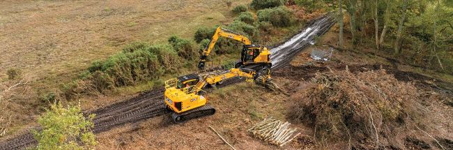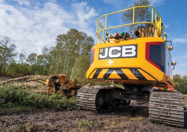 For a heathland restoration project, the team at CDFE use their JCB 150X HD to shear and fell the trees and place them into neat windrows to be forwarded on for processing. All trees to be removed have been inspected for habitat potential by a qualified ecologist and those that are identified to have potential remain as habitat. The removed product is then either chipped and turned into biomass fuel or sold as logs for firewood.