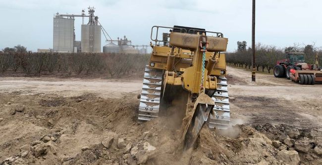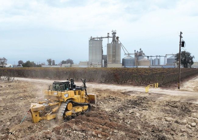 Awesome Earthmovers visited two of Josh’s projects near Reedley in the St Joaquin Valley region. The first project was part way through with the recently removed trees being fed into the Peterson 5710 horizontal grinder. The material was being fed in by a new CAT 330 Next Gen excavator with a CAT 966M wheel loader removing the mulch and stocking it for spreading and ploughing back into the ground to enrich the soils. “Years ago, we could burn the trees but as the air quality in the state has declined the government has banned the burning and is now offering grants to look at alternative methods of getting rid of the old trees. Our Diamond Z and Peterson shredders are ideal for this and can produce a good quality mulch that once the land is cleared, we spread it out and plough it back into the ground. Over the next few years as the wood decomposes, it enriches the soil for the next crops of trees.”