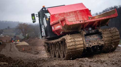 Awesome Earthmovers travelled to Heidenheim in Baden-Württemberg in southern Germany, located near the border with Bavaria, to see the PowerBully 12D tracked dumper being put through its paces by one of Max Wild’s rental customers on a muddy and swampy construction site where it easily coped with the conditions.