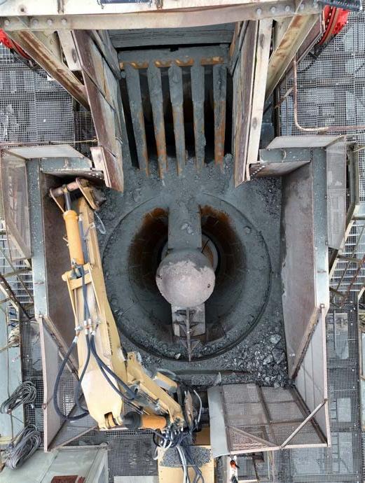 Looking at the crusher from the top of the high wall does not do it justice. It is only when you get up close that you realise it’s being attended to by a pair of 100t class wheeled loaders that the size really becomes apparent.