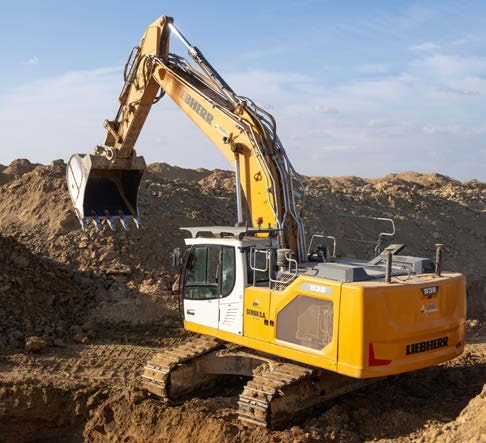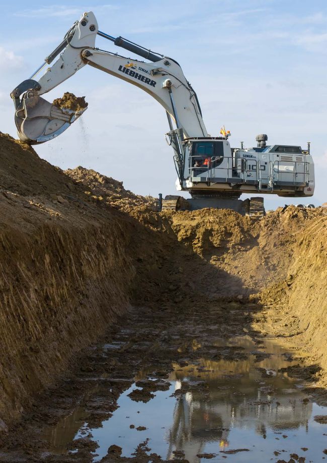 In its standard bulk excavation specification, the Liebherr is fitted with a 7.6m gooseneck boom, which is then coupled to a short, 3.2m stick. With its standard 7m3 bucket fitted, the maximum dig depth for the machine is just over 7m which is almost as deep as the trench required for the pipes to be installed. The R 9100 has also been outfitted with Leica MC1 machine guidance to assist in keeping the huge excavation for the pipes on the right level and always following the correct line. Bulking the softer material from the trench shows off just why the company has brought in this machine.