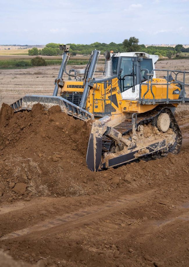 Preparing the spread for the pipeline to go through involves the stripping of the valuable topsoil to expose the sub soils below. With the spread measuring around 25m wide, Semak has deployed its largest dozer to undertake the work. The Liebherr PR 766 has an operating weight of 54 tonnes and carries a Semi-U blade with a 13.6m3 capacity. Whilst not required on this part of the project, the dozer sports a large, single-shank ripper to the rear. Working from the centre of the spread, operator Ilie Buzes pushes the hard material to the edge of the ground the project has ‘rented’ from the landowner. Once he has completed five or six passes pushing soil one way, he quickly spins the dozer around and clears the remaining material onto the opposite side of the spread. Whilst the 422hp dozer may seem to be overkill for this project, the speed at which it strips such a large volume of material means it can easily stay ahead of the excavation and pipelaying teams.