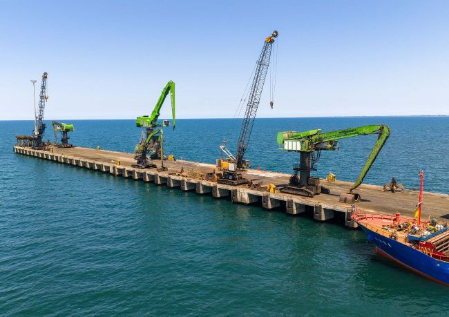 For heavier flows on larger berths, the port turns to the Sennebogen 870 E Hybrid. At up to 145 tonnes and a 27 m reach, the 870 delivers bulk-handling capacity while the Hybrid energy-recovery system keeps fuel consumption in check during repetitive cycles , a tangible benefit during long vessel loadouts and tight schedules.