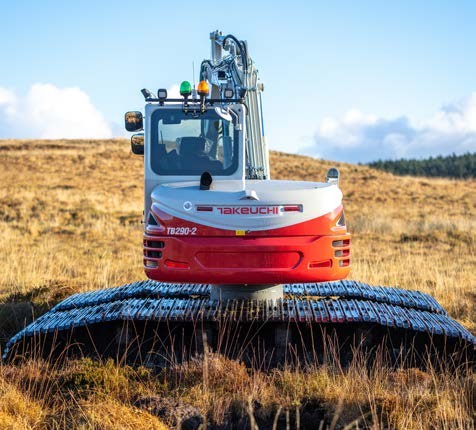 Awesome Earthmovers recently travelled to a Special Protection Area at Springwell Farm located within the Garron Plateau in the Antrim Hills to see three specially modified nine tonne Takeuchi TB290-2 excavators and a modified five tonne Takeuchi TB250-2, all fitted with Rototilt tiltrotators, at work on the extensive peatland site where the soft terrain presents a number of challenges for both men and machines.