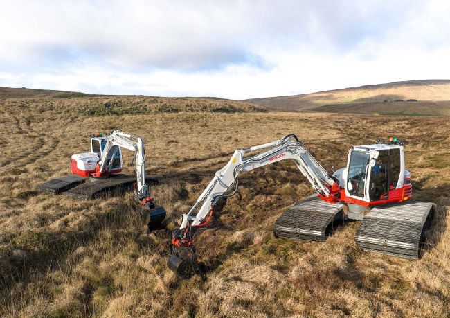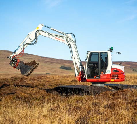 The first low ground pressure ‘bog’ spec’d Takeuchi excavators in Ireland are now being employed on a major peatland restoration scheme being undertaken in County Antrim by RSPB NI in partnership with NI Water and supported by the Northern Ireland Environment Agency’s Peatland Challenge Fund, part of the Shared Island Initiative Peatland Programme.