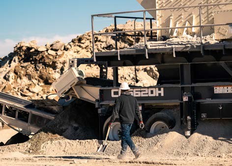 At Palmdale, a Cat 320 excavator and a Cat 988 wheel loader are used to feed a similar closed circuit set-up which incorporates a Fabtech CS2650 jaw crusher, a Cedarapids MPV380 cone crusher, a Cedarapids 6203 screen and a Superior 136 super stacker to produce a ¾ inch minus recycled base material.