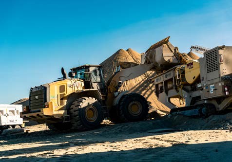 The closed circuit set-up at Ridgecrest utilises mainly Cat and Astec plant to produce one inch minus rock and 3/16-minus sand. It’s a seamless operation, with virgin rock being quarried out of the pit by a Cat 330 excavator, which is then fed by a Cat 982 wheel loader into the crushing circuit which includes an Astec FT2650 jaw crusher, an Astec FT6203 horizontal screen and an Astec FT200CC cone crusher.
